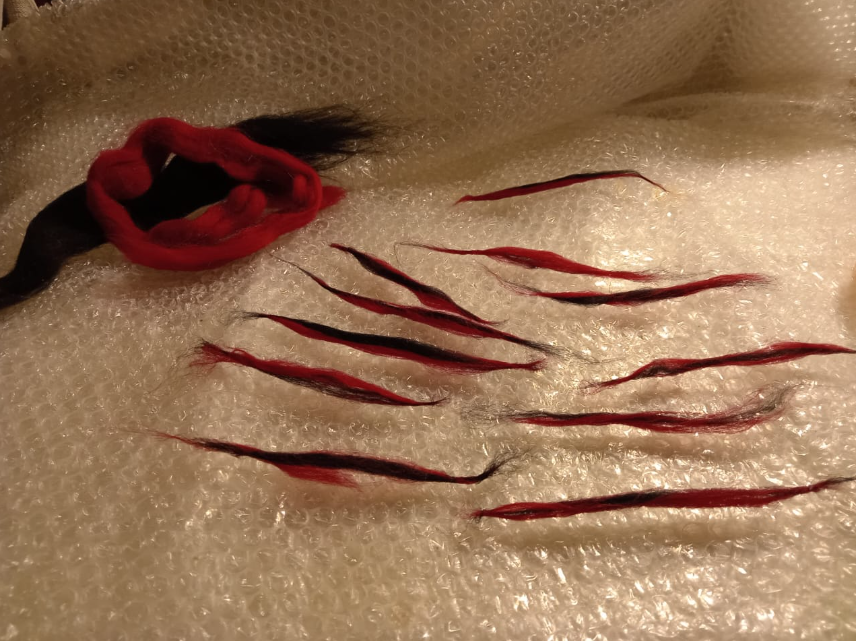 Для создания хризантемы разрываем шерсть на примерно одинаковые кусочки, примерно 10см. Сразу добавляем декоративные волокна: шерсть других цветов, вискозу, шелк.