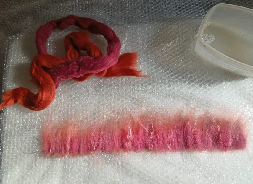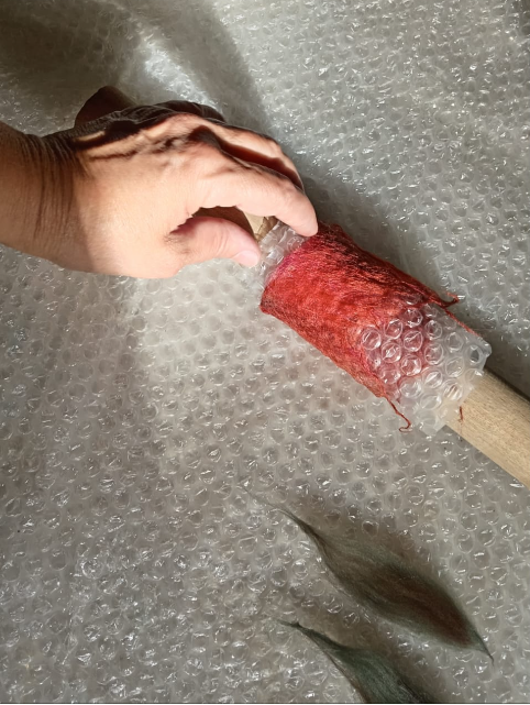 На пузырчатой пленке делаем раскладку шерсти небольшими прядями вертикально полосой примерно 50-40 см.