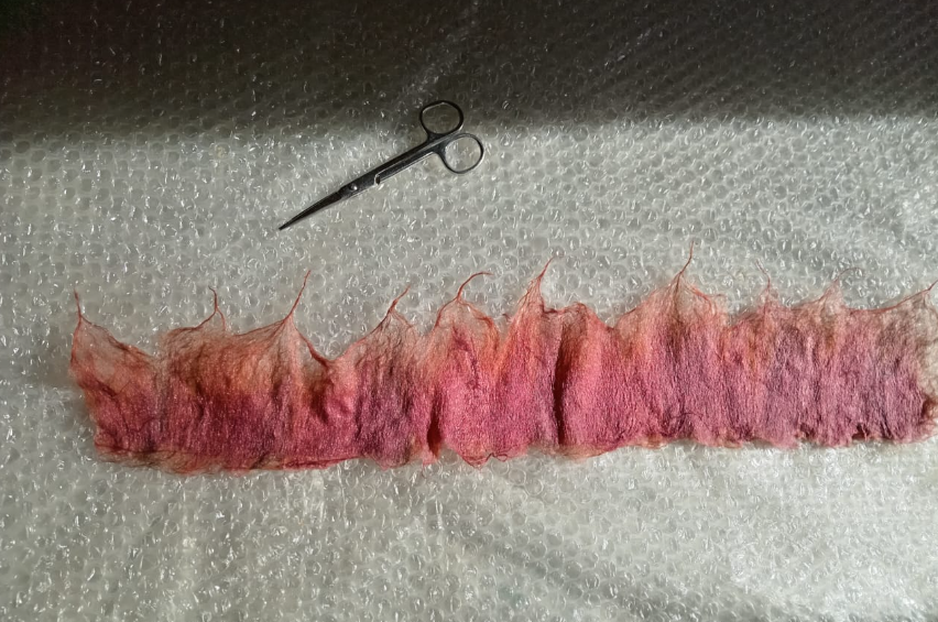 Следующий слой кладем сверху предыдущего небольшими горизонтальными (параллельно краю стола) прядями. Это делается для укрепления основания цветка. Третий слой кладем вертикальными прядями декоративные волокна и шерсть других оттенков для создания растяжки. Нижний край выравниваем подворачивая кончики вертикальных волокон внутрь. Нижняя часть полосы остается ровной, а в верху формируем подобие лепестков роз.