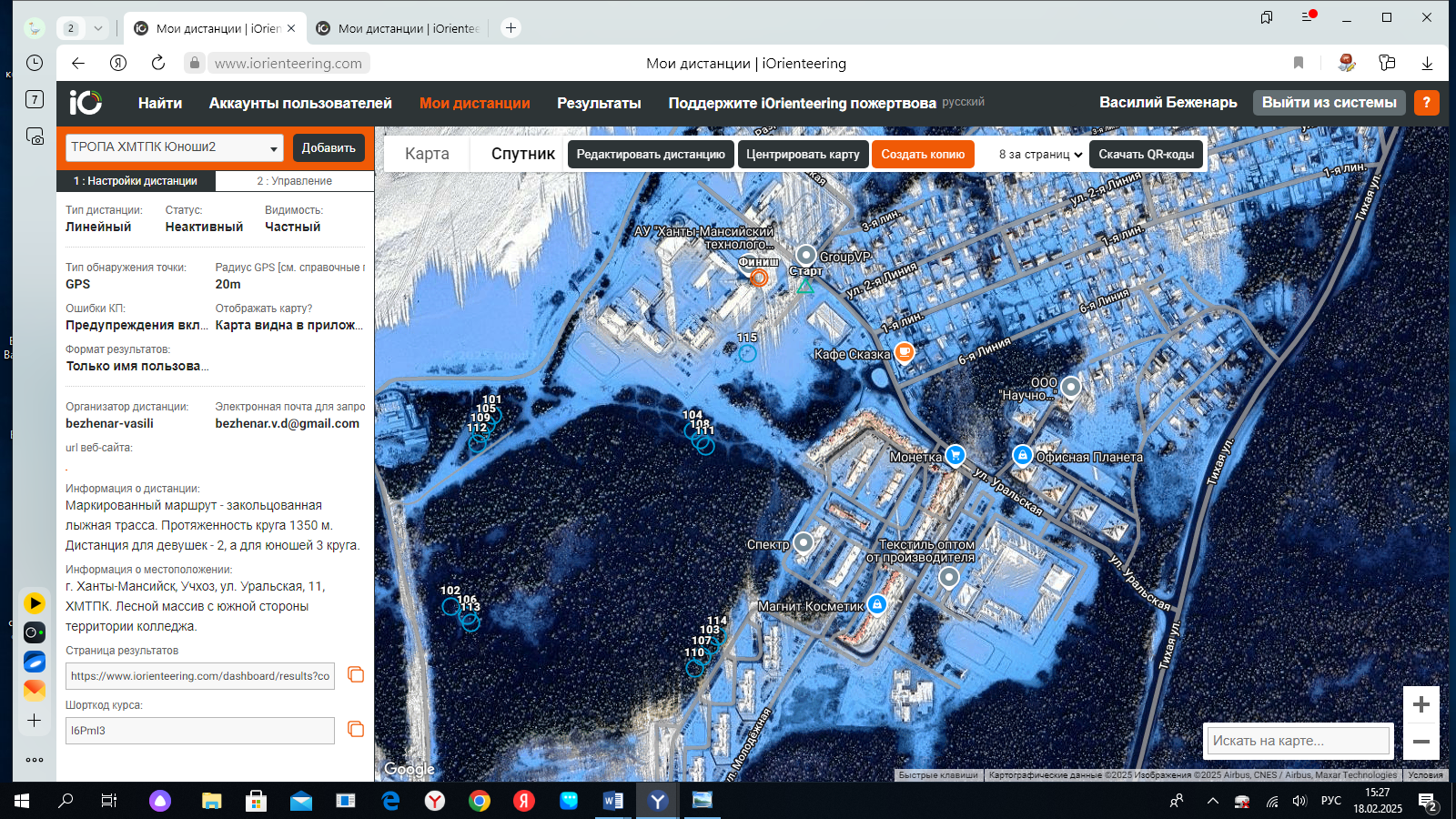 - окончание прохождение маршрута фиксируется в районе Финиша и появляется строка «Посмотреть все результаты», после нажатия на неё участник переходит на страницу с протоколом всех результатов, одновременно все данные отображаются и на компьютере у преподавателя (создателя курса). Для девушек дистанция из двух кругов по четыре КП на каждом круге. Первый круг: КП 101, 102, 103, 104. Второй круг: КП 105, 106, 107, 108.