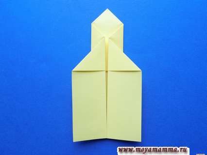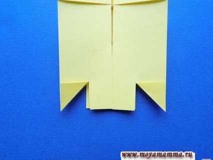 - С изнаночной стороны делаем сгибы в стороны в виде треугольников.