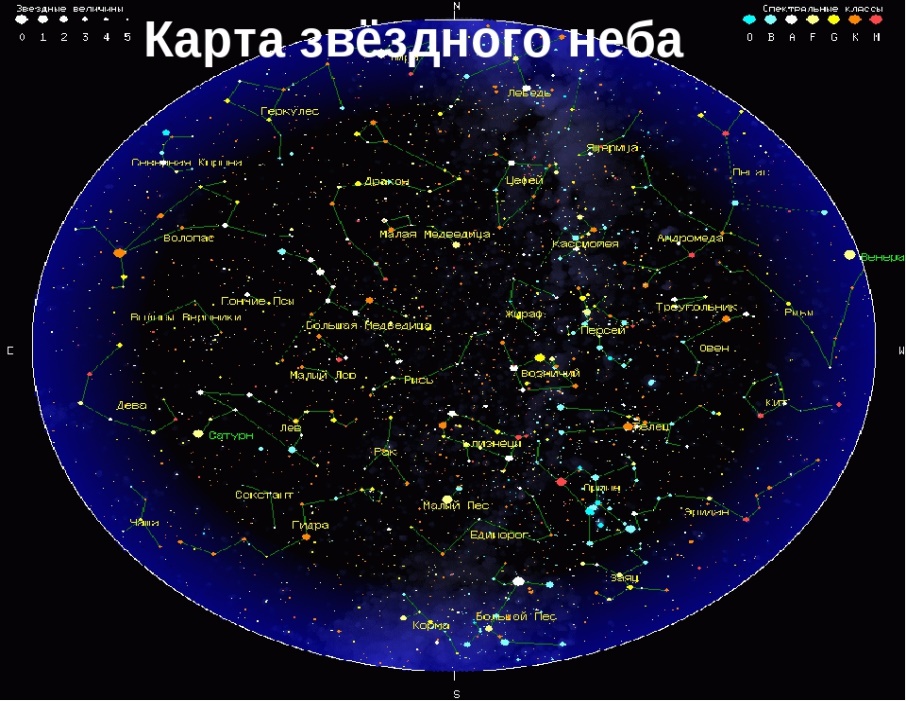В космосе, кроме планет, спутников, небесных тел, есть еще множество звезд. Они кажутся маленькими, сверкающими точками, потому что находятся очень далеко от Земли. На самом деле звёзды – это огромные раскалённые газовые шары, похожие на Солнце. Звёзды отличаются друг от друга размерами. Есть звёзды-гиганты, а есть звёзды-карлики. Самые яркие из них: Сириус, Вега, Полярная звезда и др. Множество групп звезд объединены в созвездия. В древности созвездиями назывались характерные фигуры, образуемые яркими звёздами: Орион, Андромеда, Персей, Кассиопея, Змея, Дракон, Муха, Волк и многие другие. (Показать карту звездного неба.) Ребята, а какое крупное созвездие можно увидеть на ночном небе невооруженным глазом? (Ответы детей) На что оно похоже? (Ответы детей)