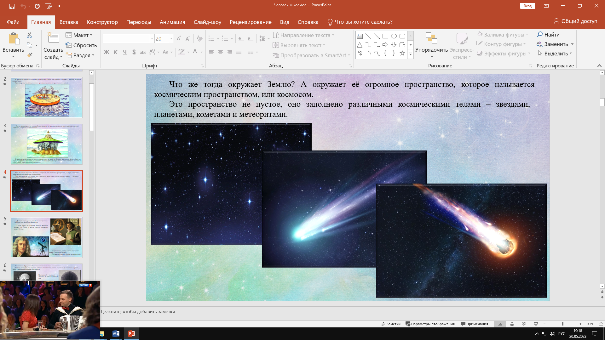 | Что же тогда окружает Землю? А окружает её огромное пространство, которое называется космическим пространством, или космосом. Это пространство не пустое, оно заполнено различными космическими телами – звездами, планетами, кометами и метеоритами. |
