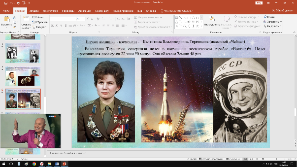 | Первая женщина - космонавт - Валентина Владимировна Терешкова (позывной «Чайка») Валентина Терешкова совершила полет в космос на космическом корабле «Восток-6». Полет продолжался двое суток 22 часа 50 минут. Она облетела Землю 48 раз. |