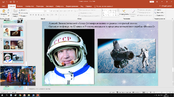| Алексей Леонов (позывной «Алмаз-2») впервые вышел из ракеты в открытый космос. Одетый в скафандр, он 12 минут и 9 секунд находился за пределами космического корабля «Восход-2» |