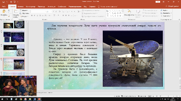 | Для изучения поверхности Луны наши ученые придумали специальный аппарат, назвали его луноход. Луноход – это машина. У нее 8 колес, чтобы можно было переезжать через кочки, ямки и камни. Управляли луноходом с Земли через мощные антенны с помощью пульта. Сверху у лунохода была большая крышка, которую открывали днем, когда Луна освещалась Солнцем. На этой крышке располагалась солнечная батарея. Эта батарея питала всю аппаратуру на луноходе. На луноходе было 2 фотоаппарата, с помощью которых он фотографировал поверхность Луны, было сделано 25 000 фотографий! |