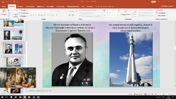 | Мечта человека побывать в космосе сбылась благодаря советским ученым во главе с Королевым Сергеем Павловичем. Он создал космический корабль, который смог подняться в малоизвестный и загадочный космос. |
