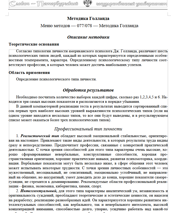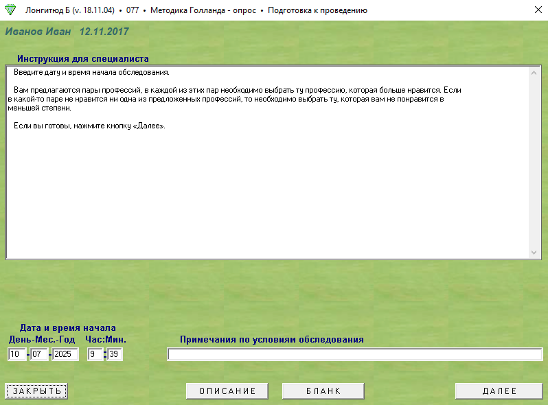 Для решения задачи по выявлению профессиональных предпочтений и личностных особенностей подростков специалисты в рамках профессиональной психодиагностики могут польховаться различными информационно-коммуникационныыми тезнологиями, одной из которых является программный комплекс для психологических исследований «Лонгитюд». Данный комплекс представляет собой набор диагностических методик, в котором отдельным блоком выделено профориентирование, предназначенное для обследования лиц 14-18 лет. Преимущество данного комплекса — удобство и быстрота обработки данных, после ввода которых автоматически формируются индивидуальные рекомендации для обследуемого, а также рекомендации для эксперта, которые можно использовать в дальнейшем консультировании и при выстраивании плана профориентационной работы.Рассмотрим подробнее специфику работы на примере методики Голланда (метод 077):При выборе методики, появляется окошко с краткой инструкцией для специалиста, который может объяснить порядок выполнения теста обследуемому, либо обследуемый самостоятельно знакомится с инструкцией.