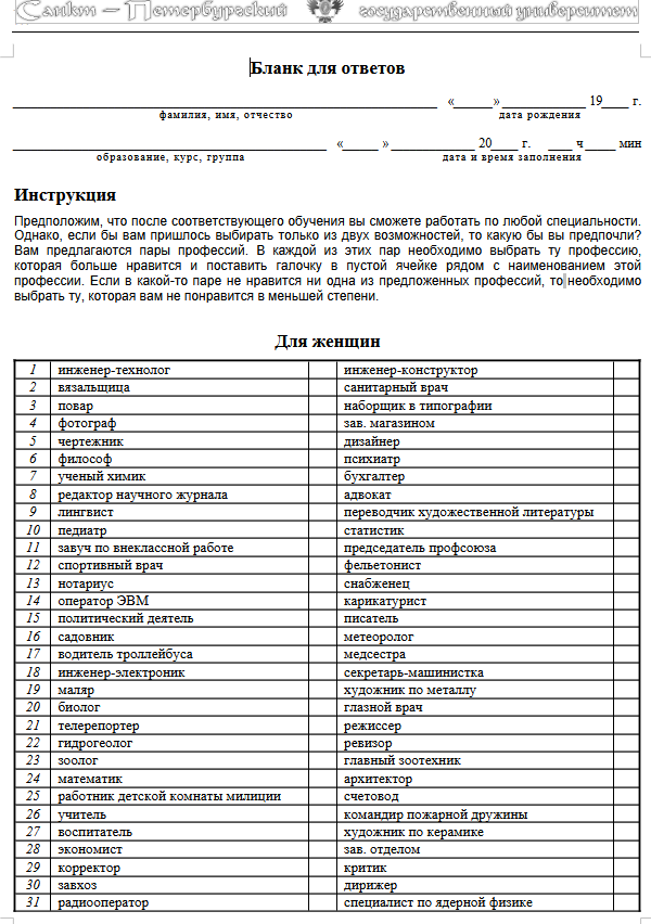 На этом этапе специалист может ознакомиться с подробным описанием методики, её интерпретацией, а также открыть чистый бланк для ответов: