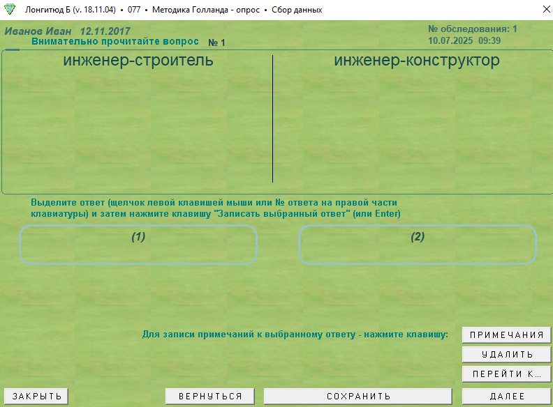 Далеепоследовательно появляются вопросы, из которых обследуемый выбирает подходящий для него вариант. Методика не ограничена по времени, обследуемый отвечает на вопросы в удобном для него темпе. Есть возможность вернуться к предыдущим вопросам, исправить ошибочный вариант ответа, сохранить ответы и приступить к продолжению теста через некоторое время с определенного вопроса.