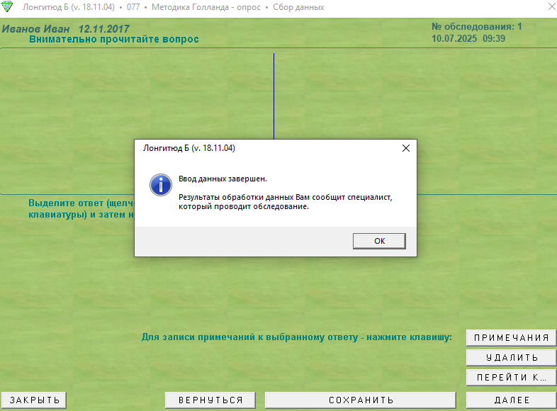 При ответе на последний вопрос, появляется надпись о том, что специалист, проводивший диагностику ознакомит обследуемого с результатами.