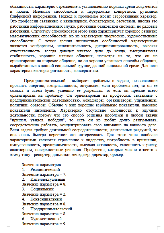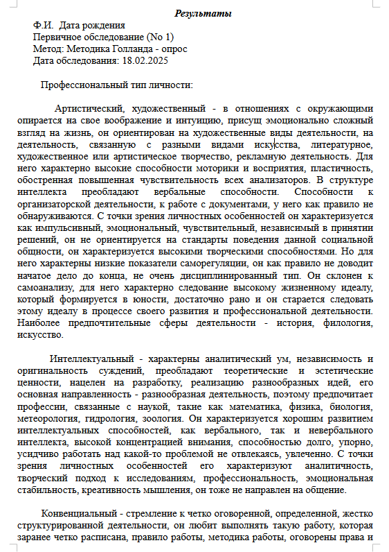 Данный алгоритм схож с остальными методиками, далее рассмотрим сформированные программой результаты при прохождении других методик.