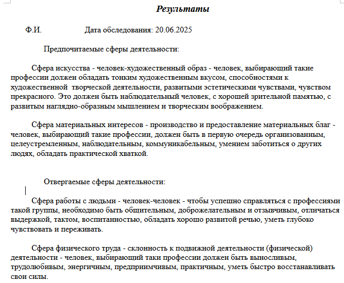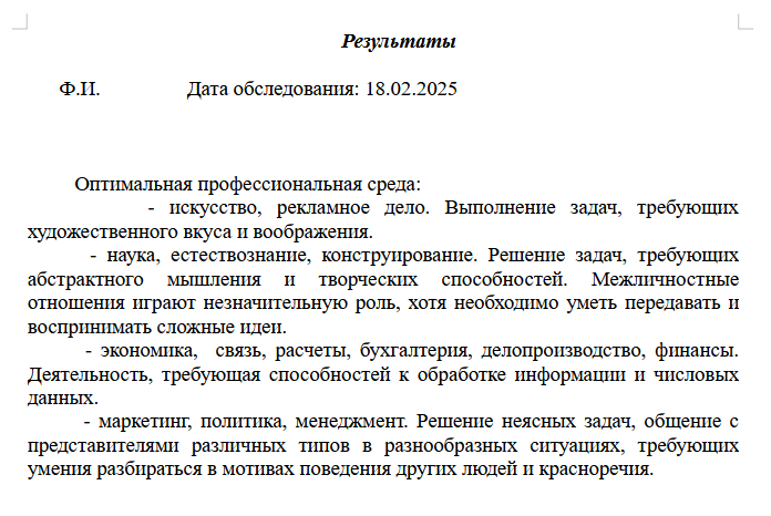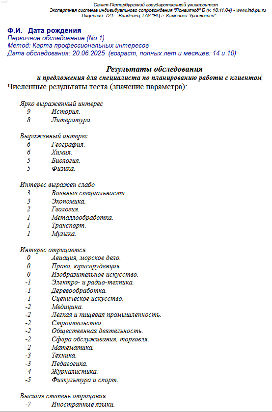 Методика «Карта профессиональных интересов» (метод 187) результаты для обследуемого: