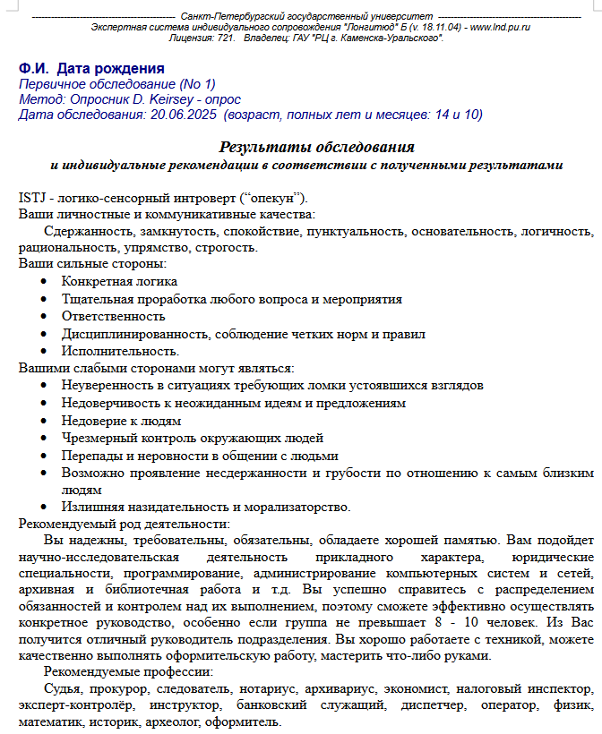 втоматически после завершения теста в программе появляются результаты диагностики в тексовом формате для эксперта и для обследуемого, позволяющие специалисту провести консультирование ребенка и его родителей, дать рекомендации, ориентируясь уже на готовые выводы по диагностике, что существенно сокращает время для подготовки к консультированию.Результаты для эксперта с подробным описанием возможных вариантов и количественными показателями теста: