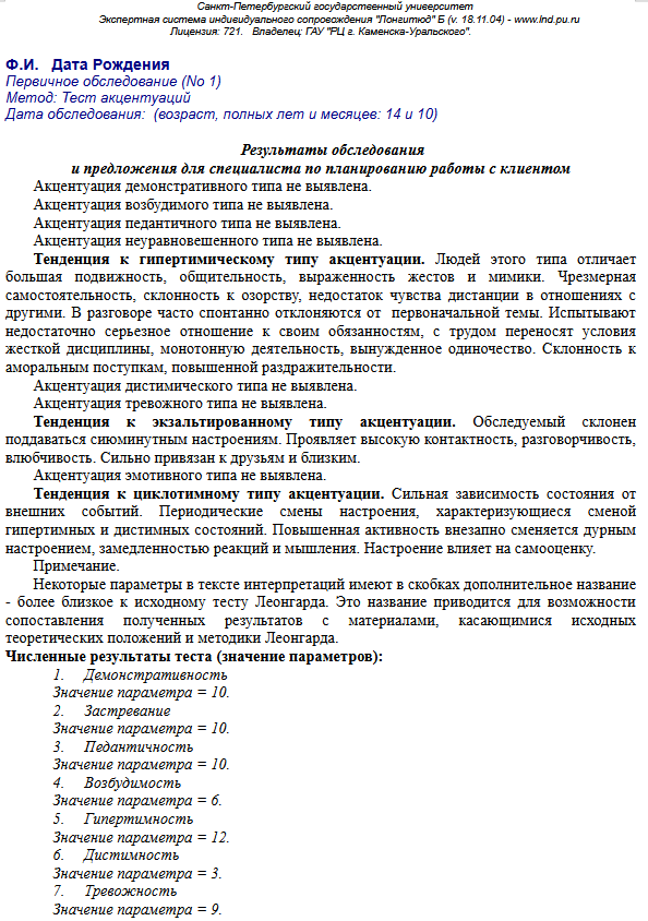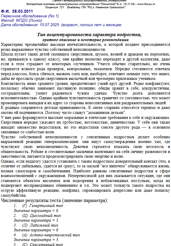 Метод МПДО Леонгарда-Личко (метод 149) результаты для эксперта: