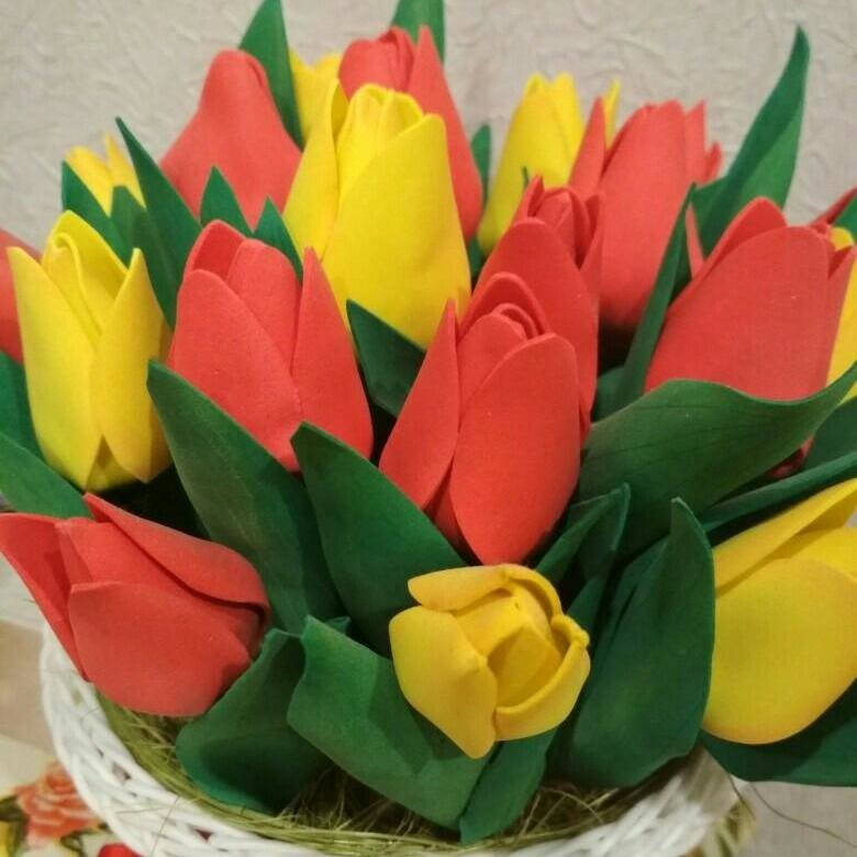 Большой букет тюльпанов, выполненных из фоамирана, подойдёт для подарка маме, бабушке, сестре, подруге или учителю на 8 Марта. Такие композиции можно использовать для украшения интерьера, они сохраняют свой первоначальный эстетичный вид длительное время, не выгорают и не портятся при попадании влаги. Особенно эффектно они смотрятся в вазах и корзинах. Представляем вам мастер-класс, который научит вас создавать красивые тюльпаны из фоамирана своими руками быстро и легко.