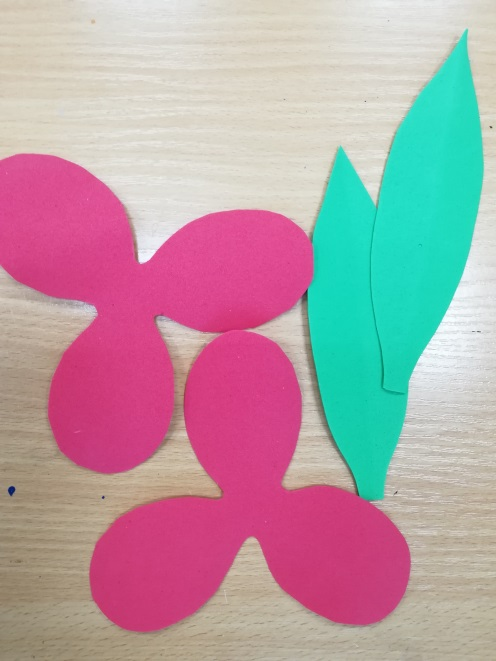 2. Обводим два раза шаблон на красном фоамиране (1мм) и вырезаем. Заготавливаем два узких и длинных листочка из зеленого фоамирана.