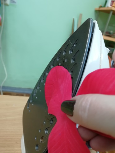 4. Проводим тепловую обработку на утюге для придария объема лепесткам и естественности листьям. Нагреваем лепестки по одному и чуть вытягиваем двумя пальцами середину. У листьев после нагревания вытягиваем край и проглаживаем середину заготовки вдоль по всей длине.
