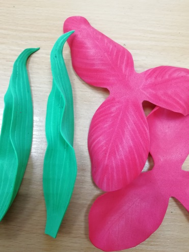3. С помощью острой части шпажки фактурируем заготовки – рисуем полоски на лепестках и на листьях с нажимом, так, чтобы не повредить фоамиран.