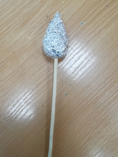 5. Далее изготавливаем основу для тюльпана. Для этого из фольги (можно использовать пищевую, для запекания) формируем конус в виде большой капли, размером с бутон тюльпана. С круглой стороны прикрепляем шпажку с помощью термоклея.