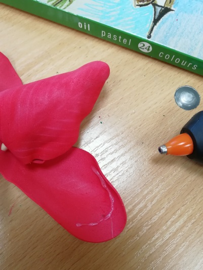 6. На каплю из фольги закрепляем заготовку для бутона. Для этого на верхнюю часть лепестка наносим клей (по кругу) и приклеиваем к острой части конуса, то же самое проделываем с другими двумя лепестками. В нижней части лепестков клей наносить не надо.