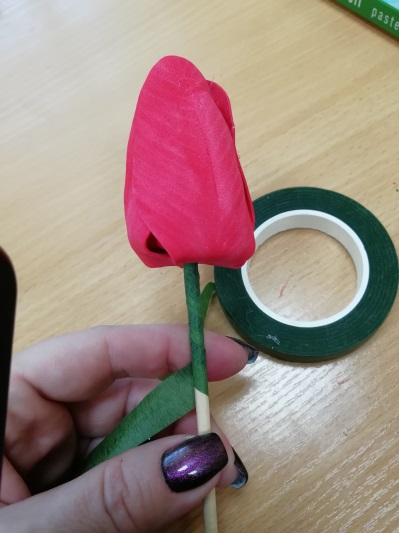 8. Бутон сформирован! Переходим к формированию стебля с листьями. Для этого под бутоном термоклеем закрепляем тейпленту так, чтобы она располагалась по диагонали к стеблю. Обкручиваем лентой с натяжением, плотно к стеблю. Через небольшое расстояние закрепляем термоклеем листья так, чтобы они располагались напротив друг друга в нижней части и ложились на бутон тюльпана в верхней части листочка.