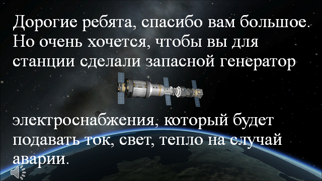 Экспериментальная деятельность/ Конструирование + стимулирование общения детей между собой. Стимулирование инициативы детей (поддержка детских идей). | А сейчас вы будете собирать электрические цепи. Вам надо рассмотреть схему, подобрать нужные детали (дети во время работы пользуются таблицами условных обозначений). -Чему вы должны следовать, чтобы у вас загорелась лампочка, вращался пропеллер? (Нужно строго следовать схеме. Работать нужно спокойно, дружно, помогая друг другу). Во время выполнения работы показываем детали, спрашиваем, как они называются, для чего они нужны в цепи. Воспитатель: Молодцы! И с этим заданием вы справились, починили систему охлаждения. Можно потанцевать. Физминутка «Космическая дискотека» (Видео) 7 слайдЗвучат сигналы, педагог расшифровывает: «Дорогие ребята, спасибо вам большое. Но очень хочется, чтобы вы для станции сделали запасной генератор электроснабжения, который будет подавать ток, свет, тепло на случай аварии». Воспитатель:ребята, откройте свои инженерные книги и по схеме соберите каждый свою электрическую цепь. Дети собирают каждый свою электрическую цепь и объединяют эти цепи в запасной генератор электроснабжения. Демонстрируют его работу. |