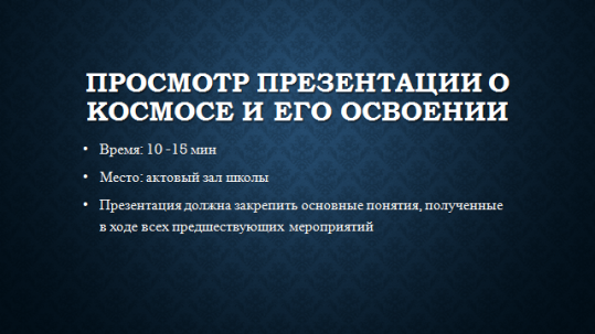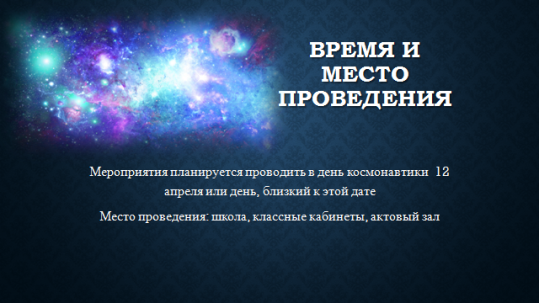 Дата проведения: мероприятия планируется проводить в День космонавтики - 12 апреля или день, близкий к этой дате