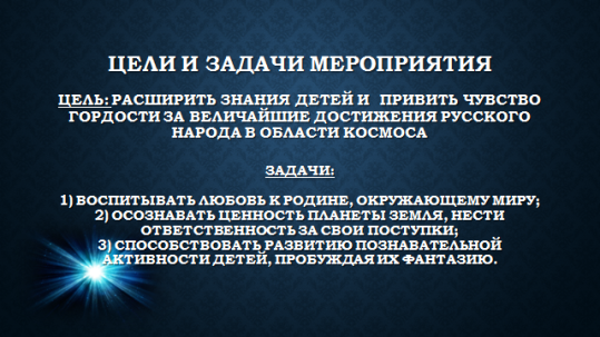 Цель мероприятия: расширить знания детей и привить чувство гордости за величайшие достижения русского народа в области космоса