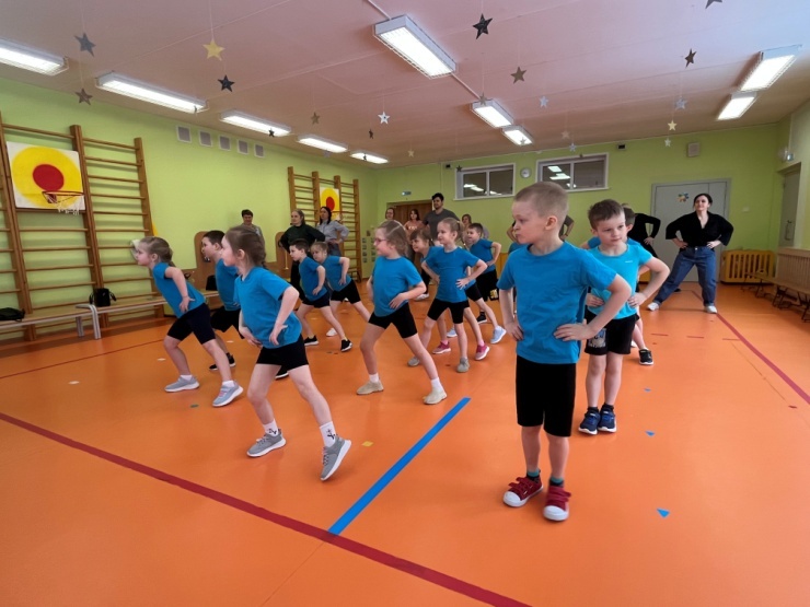 Карлсон:А знаете ли вы, где проводят испытания перед полетом в Космос? Где готовят космонавтов? В звездном городке! Но ведь мы сегодня тоже будем проходить подготовку в нашем зале, только нужно украсить его звездами еще больше!