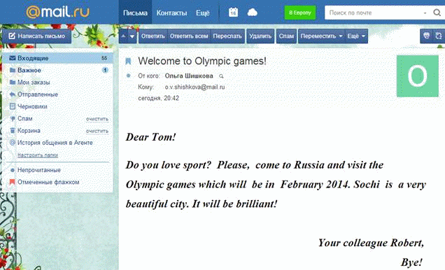Сейчас я бы хотела обратить ваше внимание на следующий слайд, я уверена, что даже те, кто не изучал английский язык поймут, о чем идет речь и практически дословно смогут его перевести на русский язык. Письмо пришло к нам по email. А кто может сказать, что означает слово mail? (ответы аудитории) Итак давайте прочитаем письмо.
