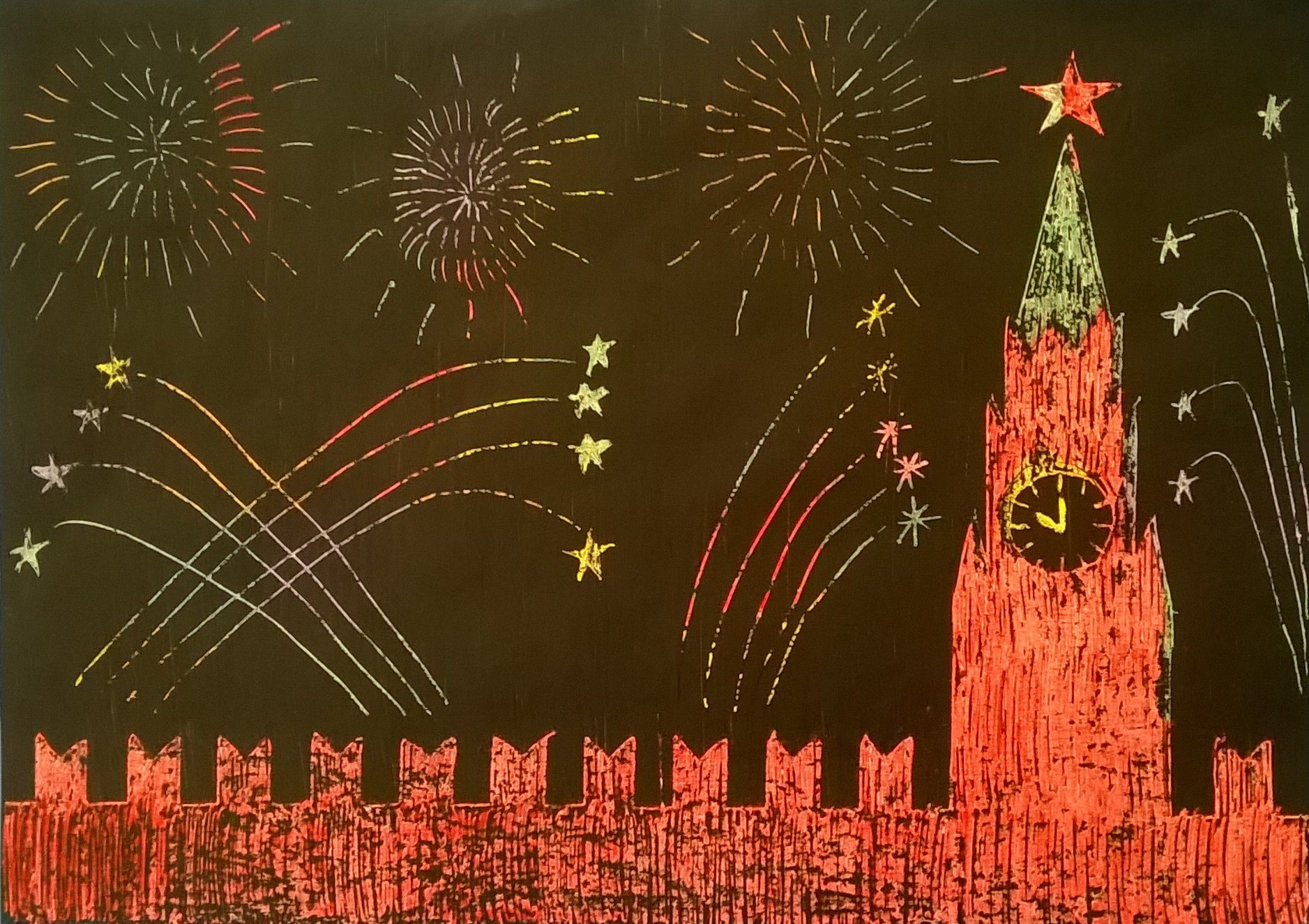 Предварительная работа: Чтение художественной литературы; беседы; рассматривание иллюстраций; слушание песен военных лет; подготовка основы для дальнейшего процарапывания: раскрашивание восковыми карандашами эскиза Спасской башни, кремлёвской стены, неба, покрытие рисунка чёрной гуашью, процарапывание по трафарету контура Спасской башни и кремлёвской стены.