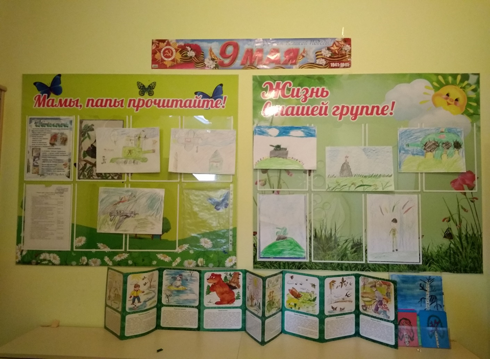Работа с родителями | - Предоставление фотографий, наград родных – фронтовиков, сведений об их участии в Великой Отечественной войне. - Предложение сводить детей 9 мая к Монументу славы, поздравить с детьми родных – ветеранов войны. | |