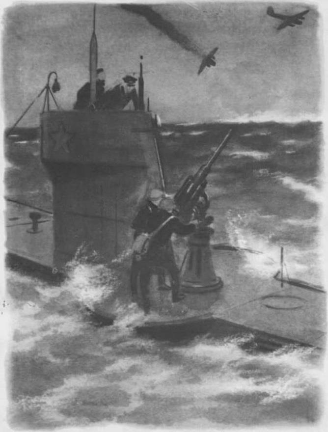«Лодка поднялась на поверхность моря. А в небе кружили два фашистских самолета. Фашисты стали бросать в лодку бомбы и стрелять из пулемётов. Наши подводники бросились к зенитной пушке. Снаряд попал в самолёт. Загорелся вражеский самолёт и упал в море. А другой самолёт улетел. Лодка погрузилась в морскую глубину».