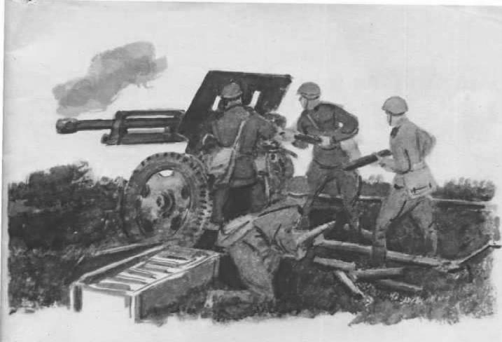 «Стали наступать фашисты. А у наших только одна пушка. Четыре артиллериста. Один снаряды подносит, другой орудие заряжает, третий целится. Решили артиллеристы: «Умрём, а не пропустим врага». Тут к нашим воинам подмога пришла. Привезли ещё пушки. Так и отогнали артиллеристы врага».