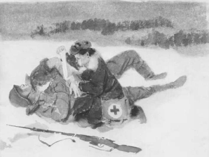 «Лежит солдат на снегу. Рука болит, пуля в груди. Глаза закрыл. Вдруг чувствует: кто-то его трогает. Это медицинская сестра из отряда. Сумка с красным крестом. Перевязала раненого солдата и потащила его в безопасное место».