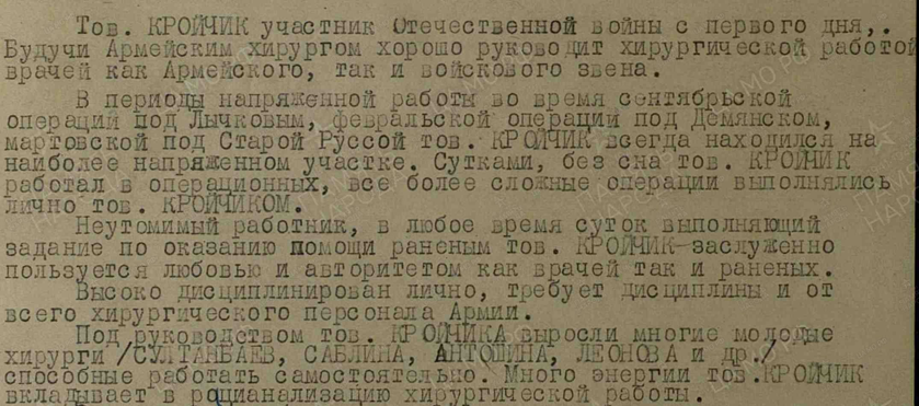 В Центральном архиве Министерства обороны имеется запись об этом непростом периоде жизни Ефрема Александровича, за добросовестность выполнения своего гражданского долга Кройчик был удостоен награды – Орден Отечественной войныII степени12.