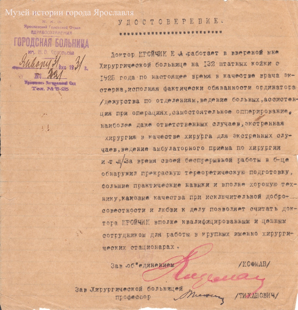 На фотографии представлено удостоверение №221 на имя Кройчика Е.А. о работе в Хирургической больнице, выданное Городской больницей им. Н.В. Соловьева 31 января 1931 г. В левом верхнем углу видна печать больницы с датой (номером телефона). Основной текст на листе написан с помощью печатной машинки чёрными чернилами. В нём написано о времени работы Е.А. Кройчика в данной больнице, о его врачебных обязанностях, должностях (дежурство, ведение больных, ассистирование при операциях, самостоятельное оперирование, экстренная хирургия, амбулаторный приём по хирургии и др.), навыках и качествах. Снизу проставлены подписи: