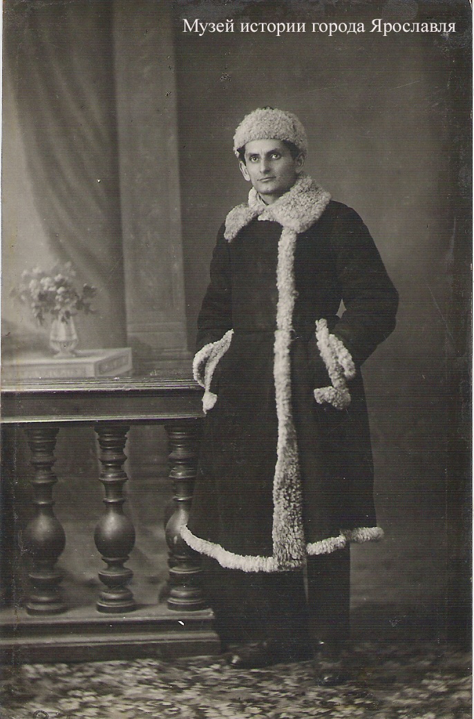 На снимке 1925 г. изображён молодой Е.А. Кройчик, недавно окончивший институт. Он одет в тулуп из овчины с меховой отделкой манжет, карманов, воротника, подола. На его голове – шапка-ушанка, тоже из овчины. О чём думает начинающий врач? Его взгляд направлен прямо, он смело смотрит в будущее. Молодой доктор стоит рядом с деревянными периллами. На заднем плане расположено окно с мраморным/каменным подоконником, на котором стоит ваза с цветами.