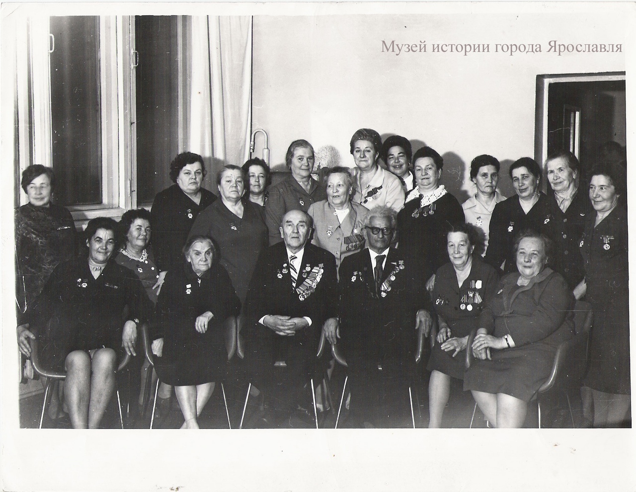 Данный групповой снимок был сделан на 70-летие врача Е.А. Кройчика в Ярославле в 1970 г. На фотографии присутствует 20 человек. Думаю, это фото было сделано в больнице. Среди них много пожилых людей с орденами. Все одеты в официальные костюмы. Е.А. Кройчик стоит в первом ряду, 3 справа. На уже поседевшем Ефреме Александровиче – очки, костюм с галстуком и множество медалей, присуждённых за безупречно выполненную работу, за навыки, проявленные в сложных ситуациях войны, за честь и храбрость, ведь длительное время трудился доктор в очень незавидных боевых условиях.
