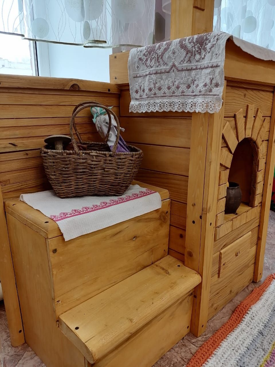 Воспитатель: Правильно, это печка. На ней можно полежать или посидеть. Детки на печке на балалайке играли, да распевали: