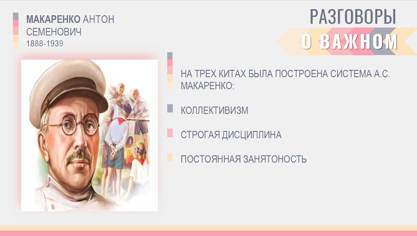 Учитель:Верно.И поэтому своё сегодняшнее мероприятие мы решили посвятить самой яркой личности в советской педагогике - Антону Семеновичу Макаренко – воспитателю, учёному, писателю.