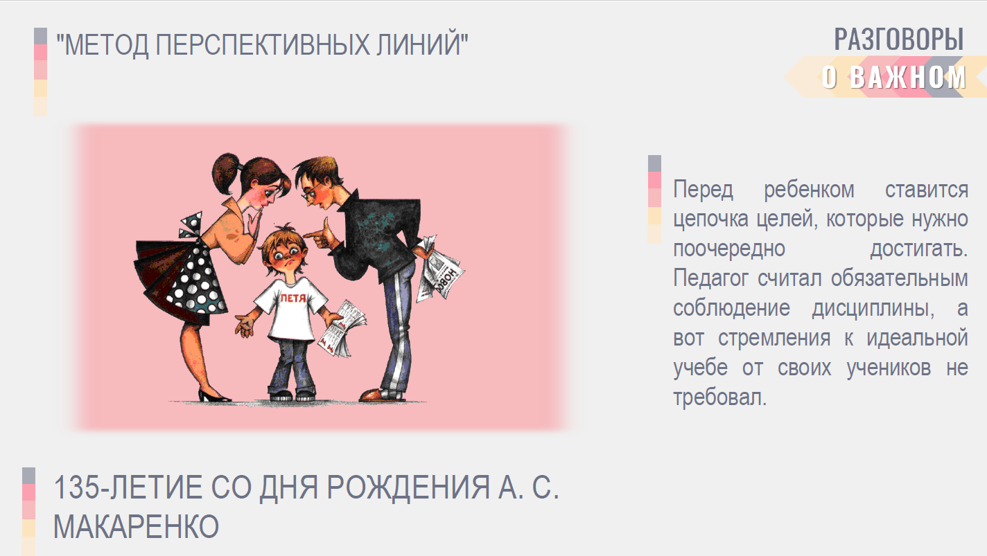 Макаренко разработал “метод перспективных линий” — перед ребенком ставится цепочка целей, которые нужно поочередно достигать. Педагог считал обязательным соблюдение дисциплины, а вот стремления к идеальной учебе от своих учеников не требовал.