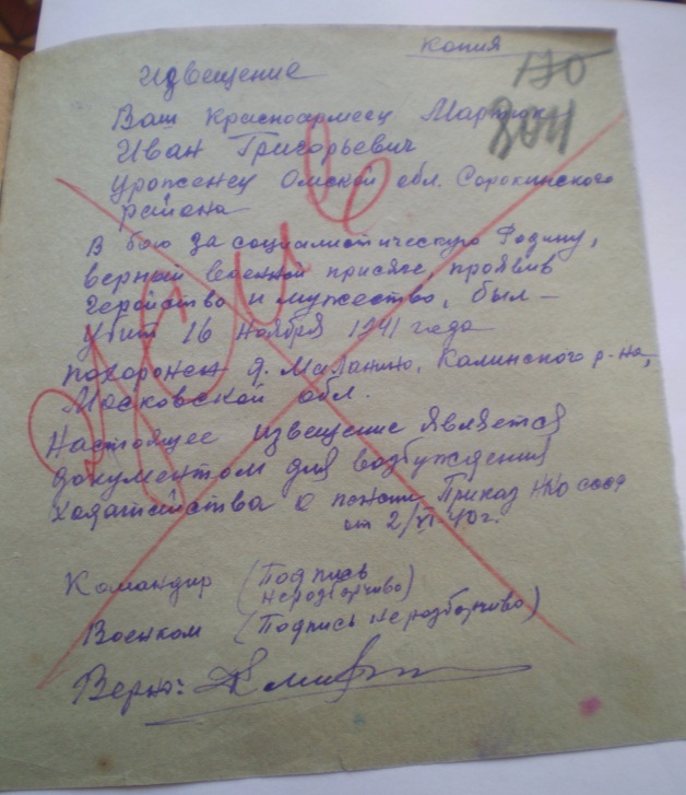 Из воспоминаний «… Немец пропустил нас в д. Малинино, а затем бросил против нас, а нас было 23 человека, 7 танков и в упор стал нас расстреливать. Из 23 человек в живых осталось лишь 2, в том числе и я… Меня тяжело ранило и зарыло в окопе землей. Проходившая следом часть обнаружила в бессознательном состоянии и отправили в в госпиталь…».