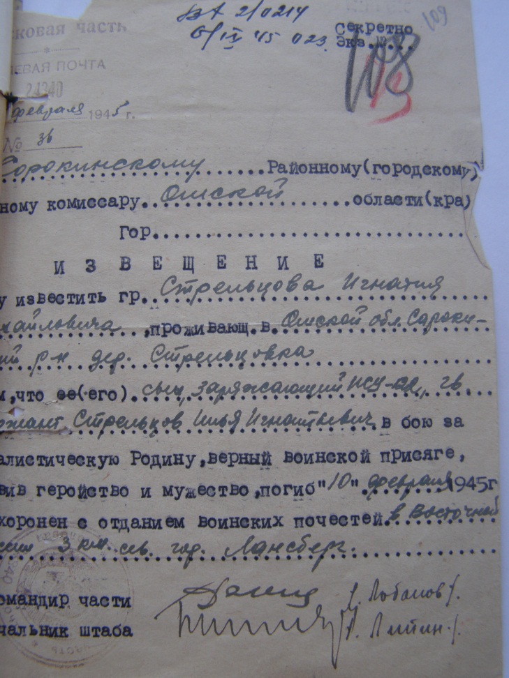 в РККА с 1942 года Место призыва: Сорокинский РВК, Омская обл., Сорокинский р-н
