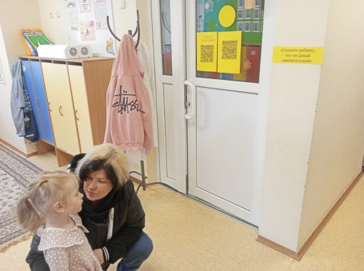 По пути движения в группу, на ступеньках лестничного марша, в коридорах развешаны высказывания: «Скажите своему ребенку, что Вы его любите», «Назовите друг друга ласковым словом» и т.д. Каждый родитель читает своему ребенку хорошие и добрые пожелания, слова любви и доброты, обнимает и целует своего малыша.