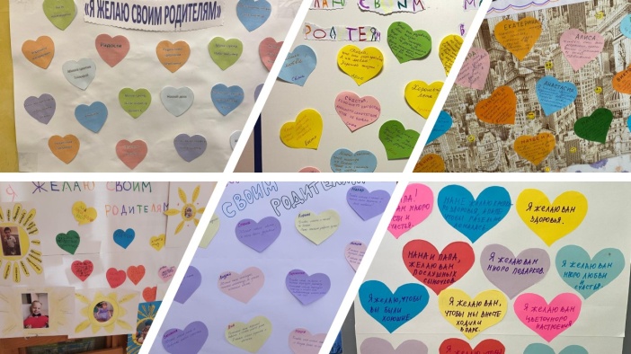 На ватмане в сердечках разного цвета, записываются пожелания детей своим родителям (дети самостоятельно или с помощью воспитателей).