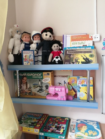 Центр сюжетно-ролевых игр. В данном центре имеются атрибуты к сюжетно-ролевым играм профессиональной направленности - «Поликлиника», «Больница», «Магазин», и др. подбираются, чтобы создать условия для реализации интересов детей в разных видах игр. Также собраны костюмы, предметы-заместители для сюжетно-ролевых игр, переносные контейнеры с атрибутами к таким играм как: «Парикмахерская», «Салон красоты», «Супермаркет», «Кафе» и д. Подобранный игровой материал позволяет комбинировать различные сюжеты, создавать новые игровые образы. Ведь именно в сюжетно-ролевых играх усваиваются сведения о профессиональной деятельности взрослых, закрепляются знания, полученные в ходе непосредственно образовательной и совместной деятельности. О том, что эти знания достаточно сформированы, говорит то, что дети охотно берут на себя ведущую роль, правильно выполняют ролевые действия, могут самостоятельно выбрать оборудование и игровые атрибуты.