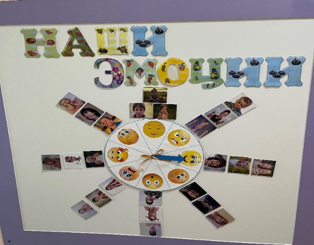 - Игра «Покажи эмоции»: выбранный ребенок загадывает какую-либо эмоцию и мимикой изображает её, а дети пытаются угадать эту эмоцию переставляя стрелочку.