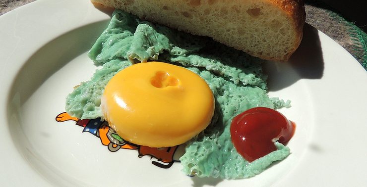 Приготовленная зеленая яичница — это нормально, она вкусная и совершенно съедобная. А совершенно инопланетный цвет, надеемся, добавит аппетита! Помните, как в знаменитой комедии «Джентльмены удачи» Евгений Иванович Трошкин с помощью фантазии уговорил детей покушать? Примерно такую же сценку можно при желании разыграть и со своим малышом, предложив космическую зеленую яичницу для космонавтов. Экспериментируйте вместе с нами, занимательная химия — это здорово и полезно!